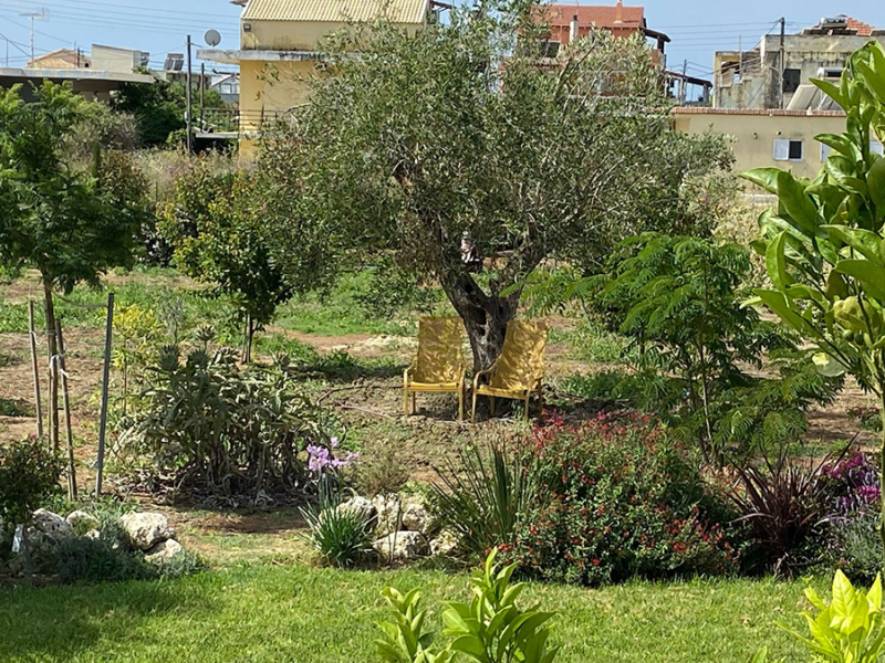 Der wunderschön eingewachsene Garten ist mit mediterranen Pflanzen angelegt (Olivenbäume, Palmen etc.).